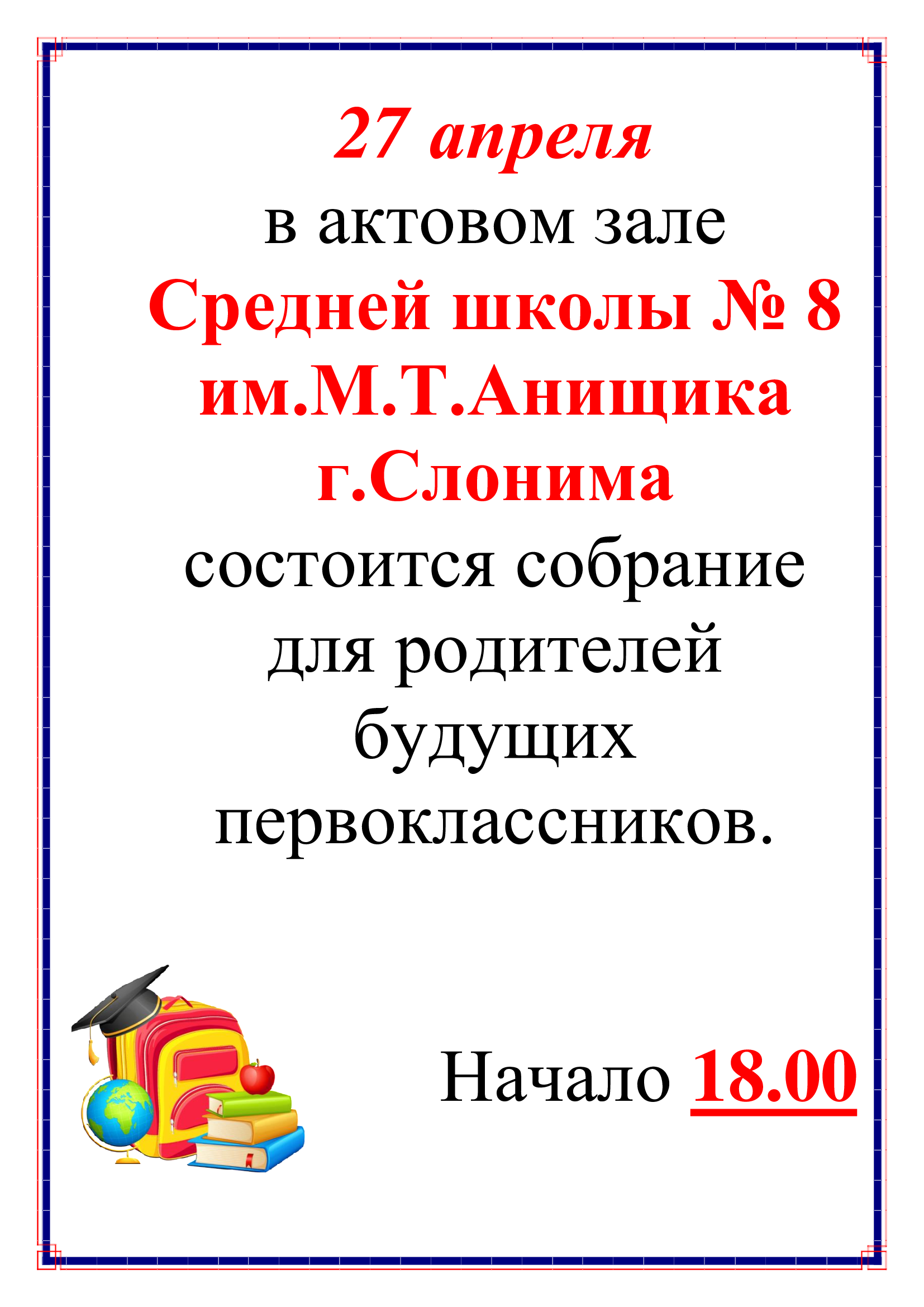 Да ўвагі законных прадстаўнікоў будучых першакласнікаў 2026/2027 навучальнага года